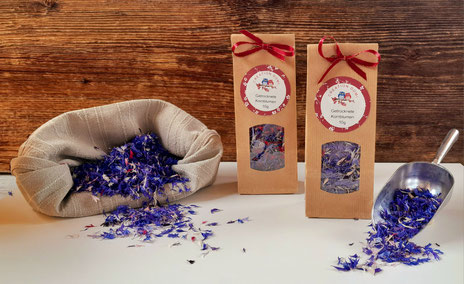 Getrocknete Kornblumen in verschiedenen Farben aus unserem Garten.