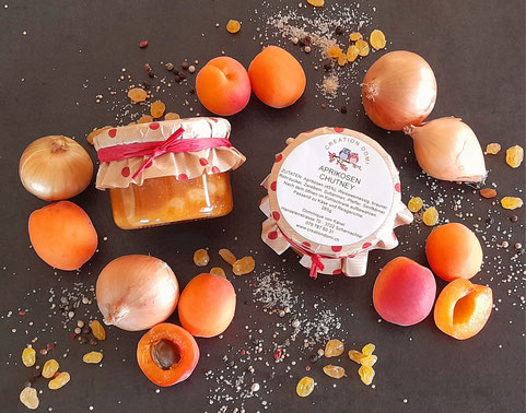 Aprikosen 45%, Weissweinessig, brauner Rohrzucker, Zwiebeln, Sultaninen, Pfeffer und Senfkörner.